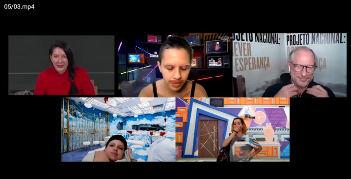 A partir de uma investigação do uso de fundos de tela na plataforma zoom e da interação com outros aplicativos de manipulação digital, criamos uma performance online em tempo real, que mistura nossas presenças físicas e virtuais às imagens capturadas da internet, propondo um entrelace entre pixels, atualidades, política, memes e afetos.